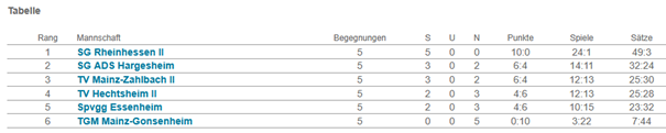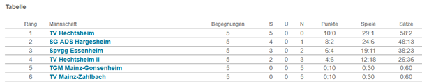 Gegen die Konkurrenz aus Mainz zeigte die Mannschaft ihre Stärke: Sowohl gegen den TV Mainz-Zahlbach als auch gegen die TGM Mainz-Gonsenheim gelang jeweils ein klarer 4:1-Sieg.Besonders ärgerlich waren die beiden knappen 2:3-Niederlagen gegen die SG ADS Hargesheim und die Spvgg Essenheim. Hier wäre mit etwas mehr Glück ein Punktgewinn möglich gewesen. Gegen den souveränen Tabellenführer SG Rheinhessen musste man sich hingegen deutlich mit 0:5 geschlagen geben – ein Ergebnis, das die Stärke des Ligaprimus widerspiegelt. Mit der Einteilung in die Verbandsliga wartet nun eine spannende Herausforderung. Die knappen Spiele haben gezeigt, dass unser Team mit den Spitzenmannschaften mithalten kann. Deshalb hat sich die Mannschaft ein klares Ziel gesetzt: Sie will in der Verbandsliga ganz vorne mitspielen und den Titel angreifen!